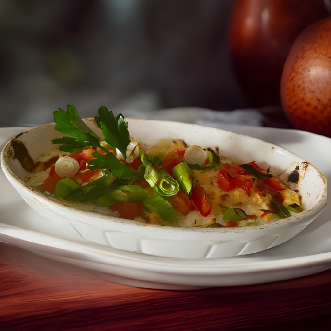 pikant zubereitete Schafskäse-Creme mit Tomaten & Lauchzwiebeln aus dem Backofen