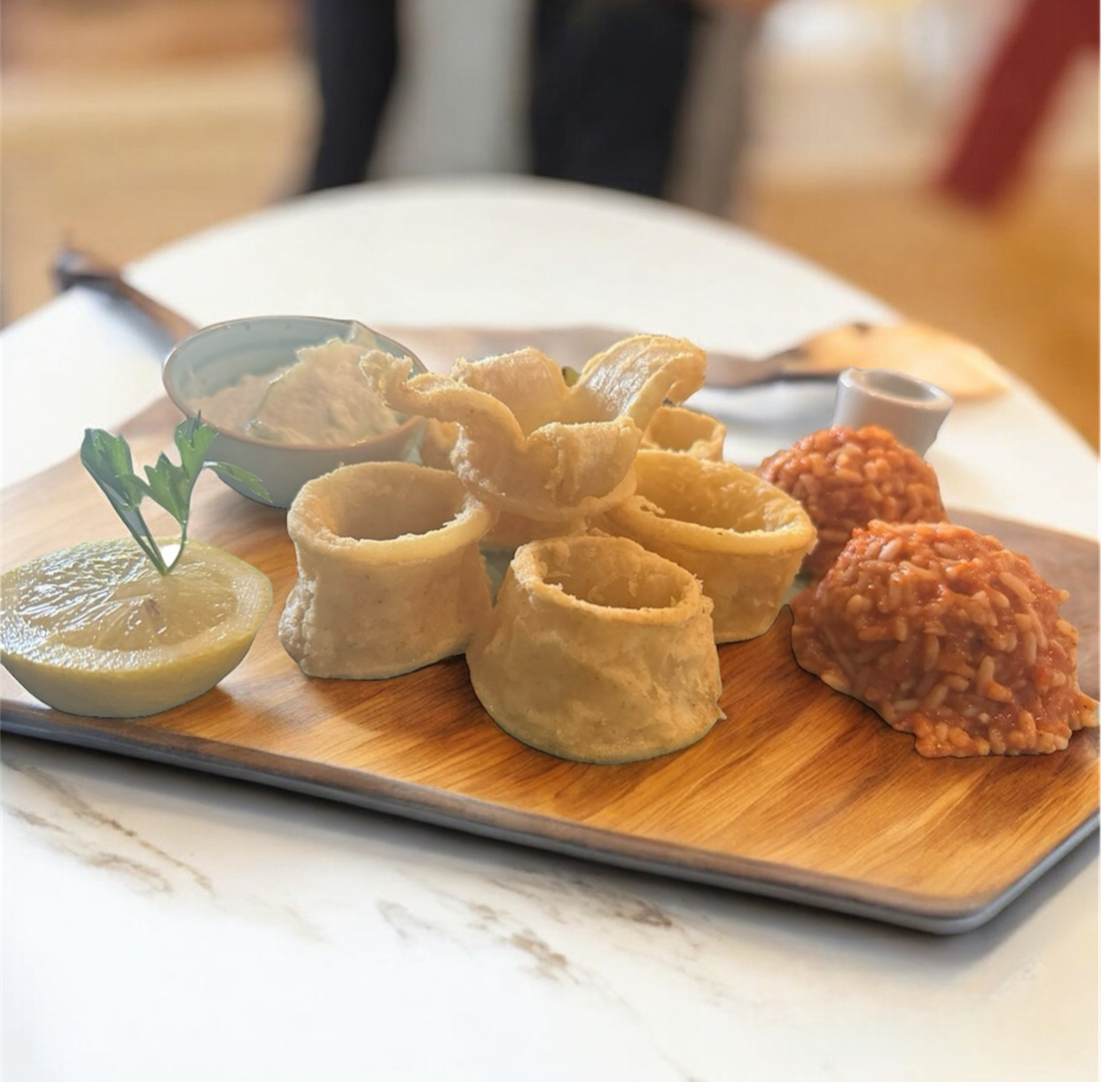 Frittierte Calamari-Ringe mit Reis, Zaziki & gem. Salat