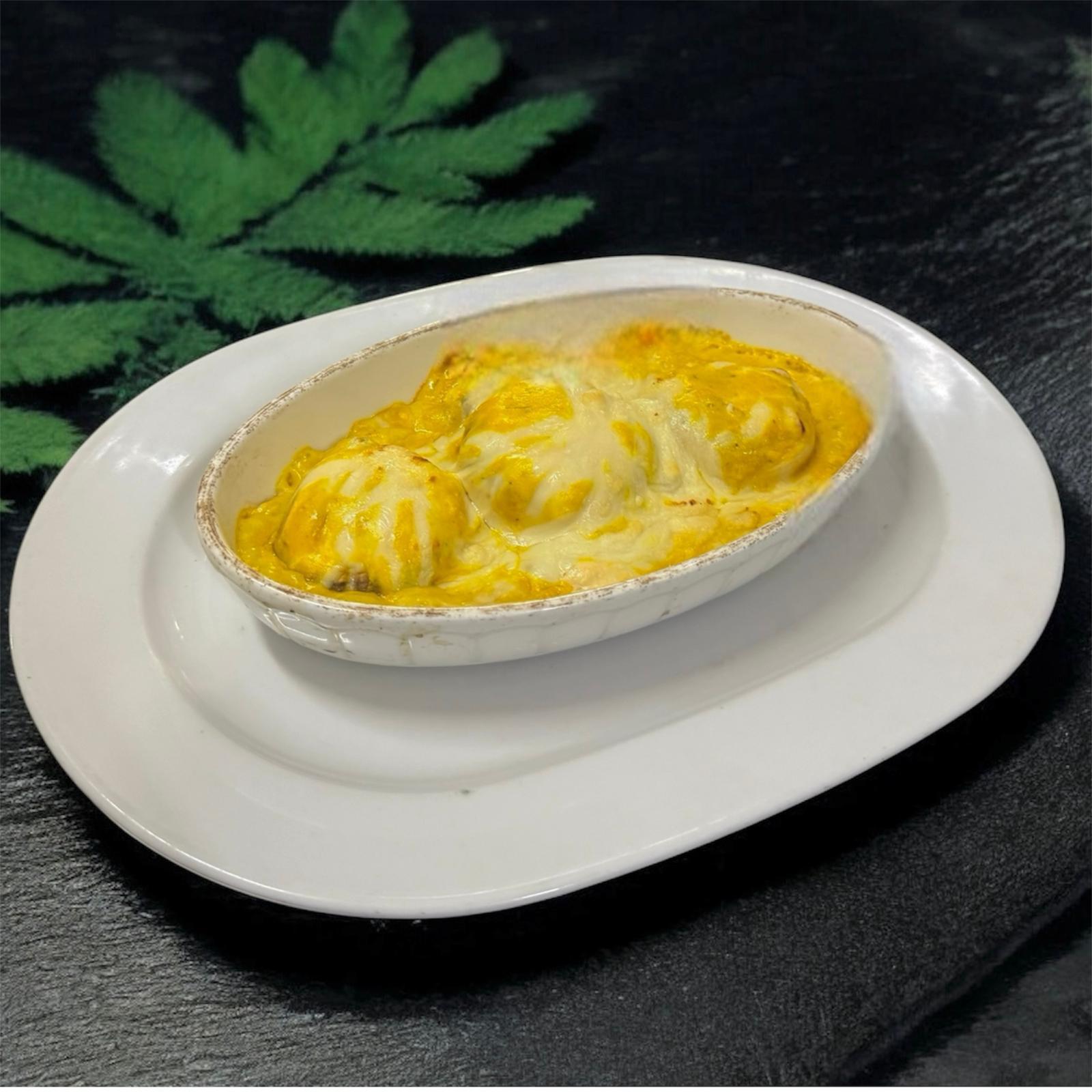 in cremiger Kurkuma-Sauce, überbacken mit Käse, gefüllt mit Feta-Creme