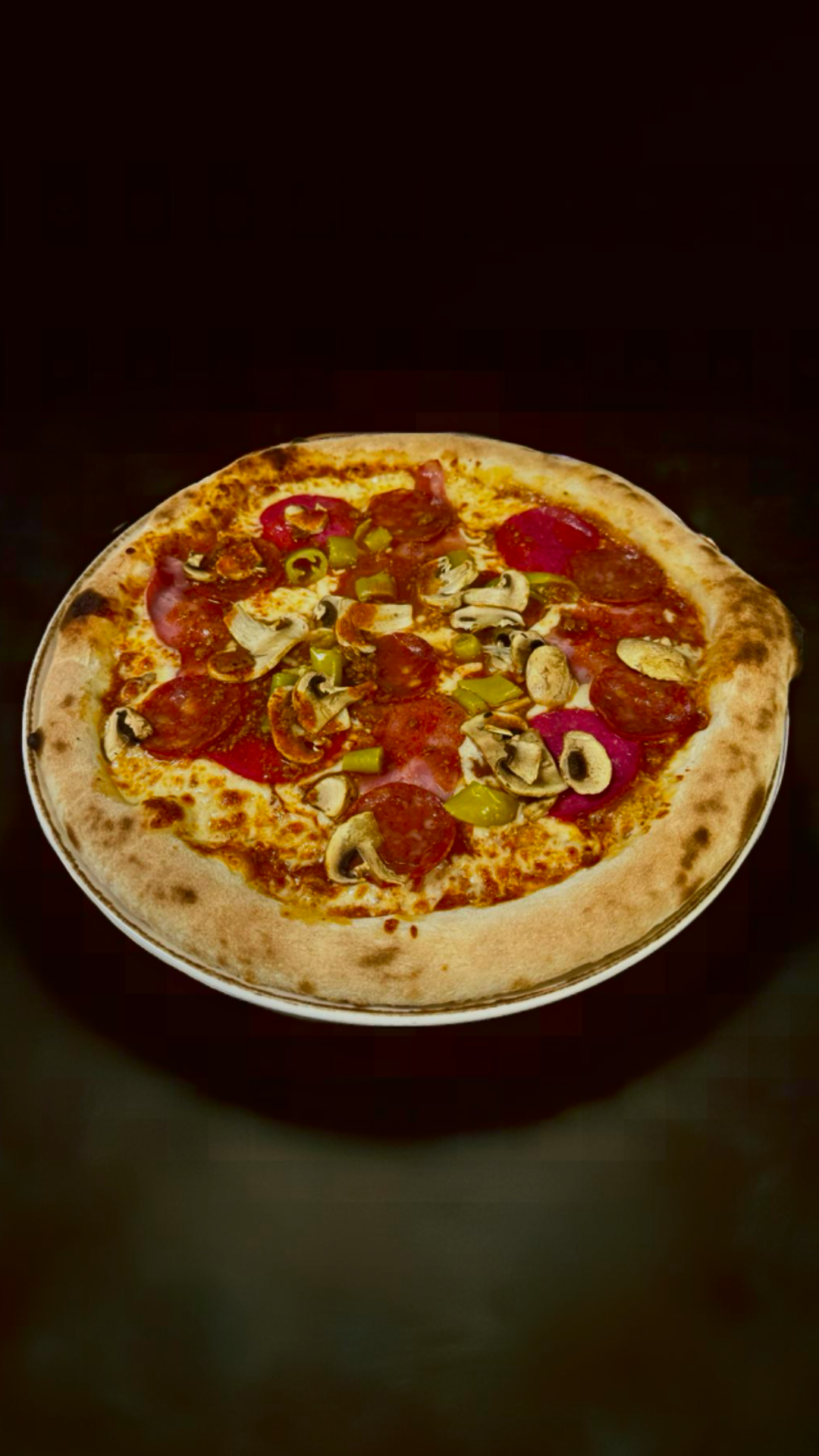 Hackfleischsauce, Mozzarella, scharfe Salami, Peperoni, Zwiebeln