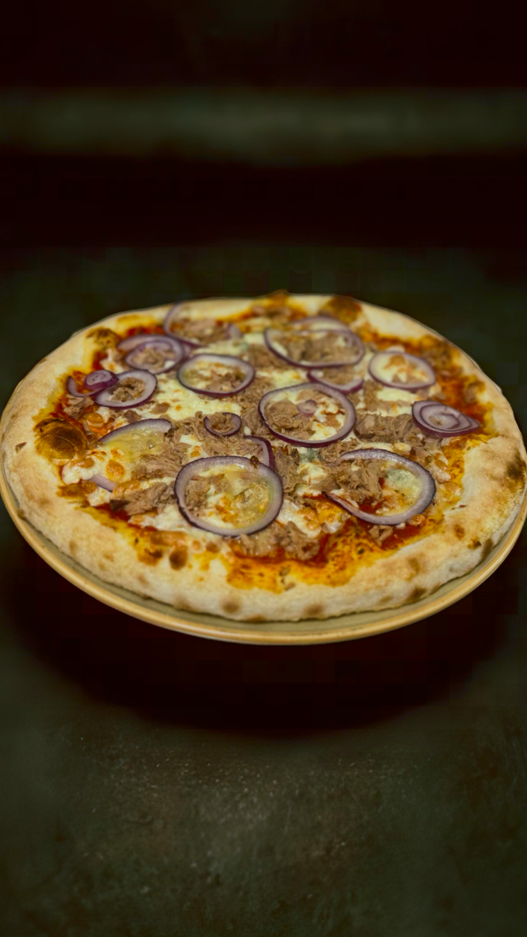Tomatensauce, Mozzarella, Thunfisch, Zwiebeln