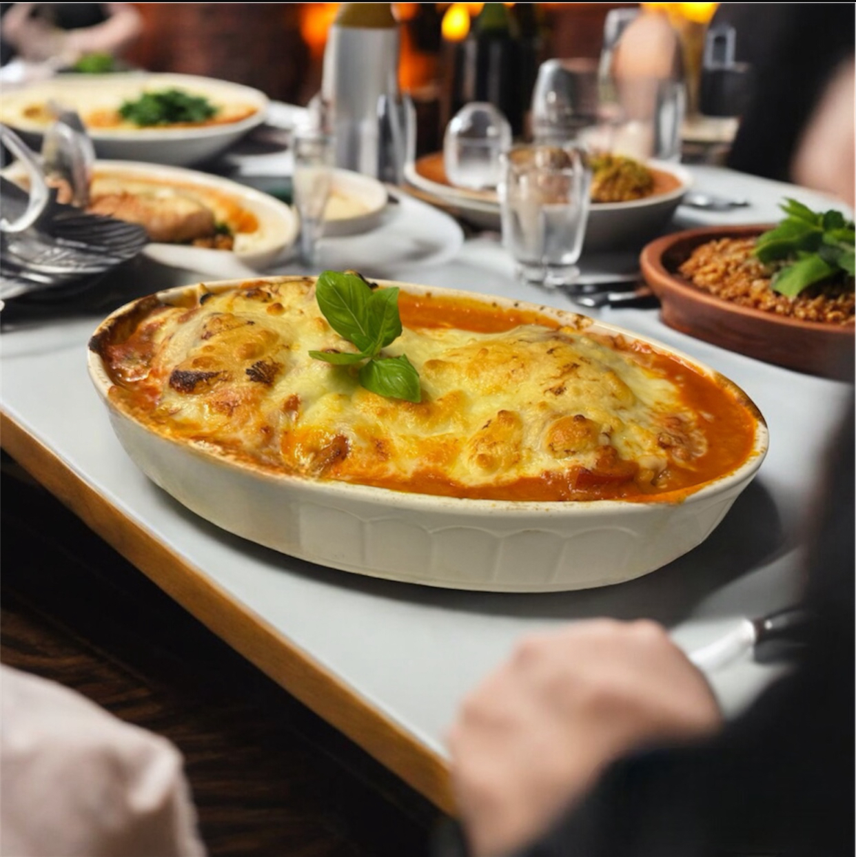 2 Fleischspieße, überbacken mit Käse in Metaxasauce, Reis & gem. Salat
